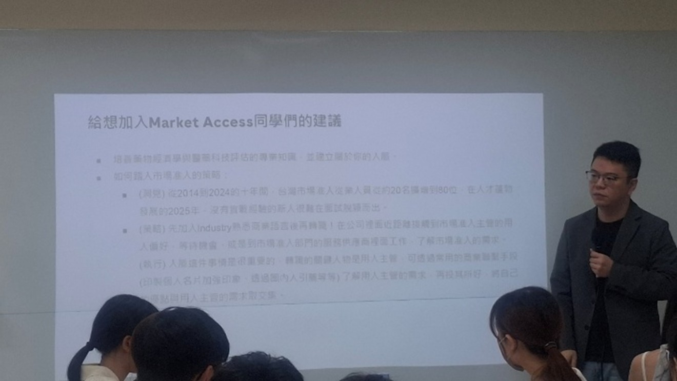 活動後半場由兩位任職於知名大藥廠的MA 講者– 李俊毅講師與方琪惠講師。藉由兩位講師在市場準入的實務經驗分享。我理解到MA 的工作不僅需熟悉藥品市場與給付政策,更需具備跨部門溝通與策略提案的能力。市場準入的本質在於確保新藥能以最適當的方式進入市場,並獲得合理的給付條件。在審核過程中,若定價策略未獲通過,需持續修正並重新提交建議,這也是為甚麼從事MA通常需要高抗壓性與一定程度的熱情。MA 的工作可說是緊密連結病人需求、政府資源配置與企業策略的關鍵節點。此外,俊毅講師也分享了自身從藥師轉職為MA 的歷程,並指出MA 領域近年來人才需求逐漸攀升,是藥業中極具潛力的職涯方向。他也提醒有志投入此領域的學生,除了掌握機會與時機,更需提前規劃、積極準備,方能勝任挑戰。