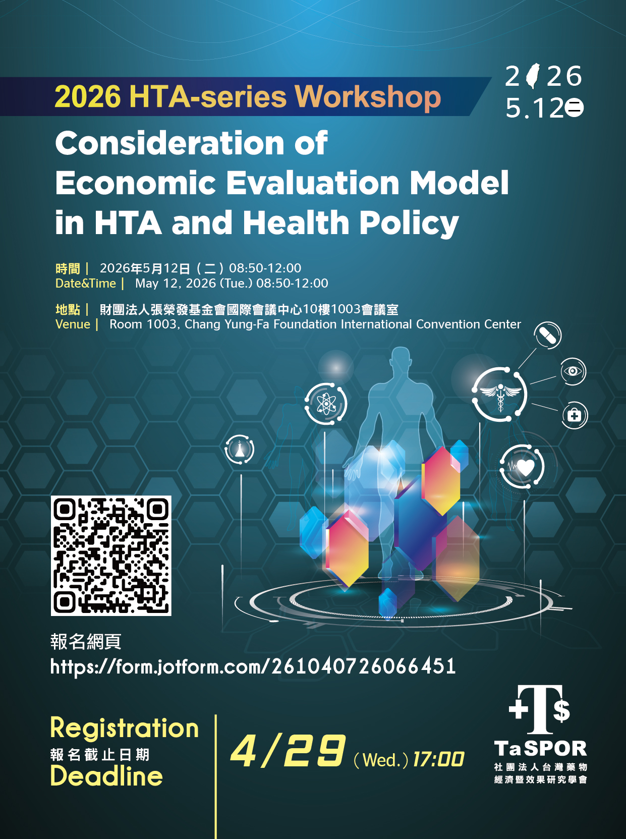 本會將於2026年5月12日舉辦「HTA-series Workshop:Consideration of Economic Evaluation Model in HTA and Health Policy」會議,邀請相關專家進行討論,活動資訊與議程如下,報名時間為即日起至4/29(三)17:00前,或額滿為止。